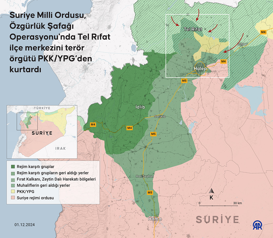 Suriye Milli Ordusu (SMO), PKK/YPG'nin Tel Rıfat ile Suriye'nin kuzeydoğusu arasında terör koridoru oluşturma planına karşı Özgürlük Şafağı Operasyonu'nu başlattı. (Grafik: Yılmaz Yücel/AA)01 Aralık 2024•Güncelleme: 01 Aralık 2024