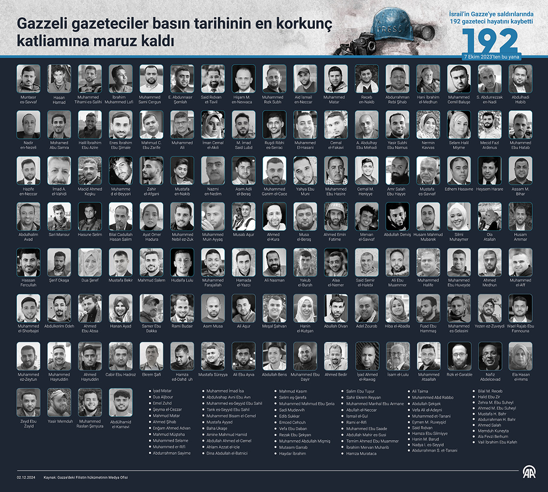 İsrail ordusunun, Gazze Şeridi'ne düzenlediği saldırılarda ölen gazeteci sayısı 192'ye çıktı. (Grafik: Muhammet Zeyd Karaaslan/AA)