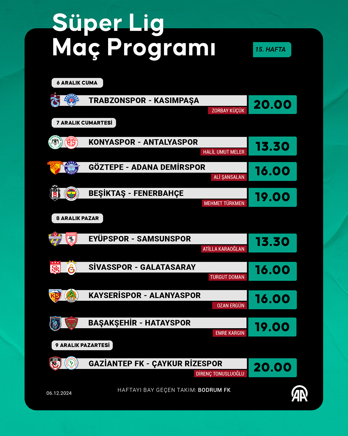 Süper Lig 15. hafta programı