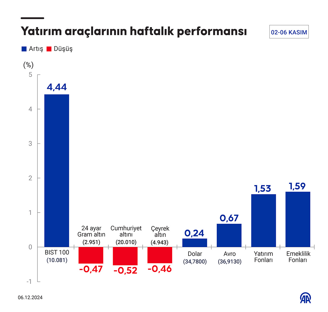 Borsa İstanbul'da işlem gören hisse senetleri haftalık bazda ortalama yüzde 4,44, dolar/TL yüzde 0,24 ve avro/TL yüzde 0,67 artarken, altının gram fiyatı yüzde 0,47 azaldı.