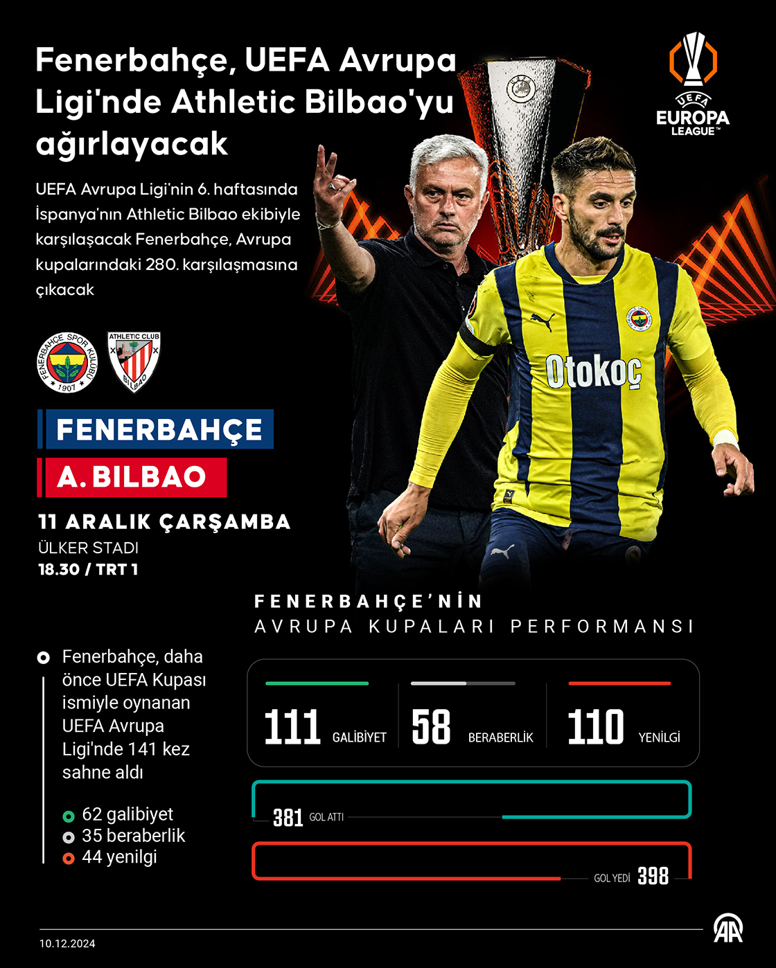 UEFA Avrupa Ligi'nin altıncı haftasında İspanya'nın Athletic Bilbao ekibiyle karşılaşacak Fenerbahçe, Avrupa kupalarındaki 280. karşılaşmasına çıkacak. (Grafik: Kemal Delikmen/AA)