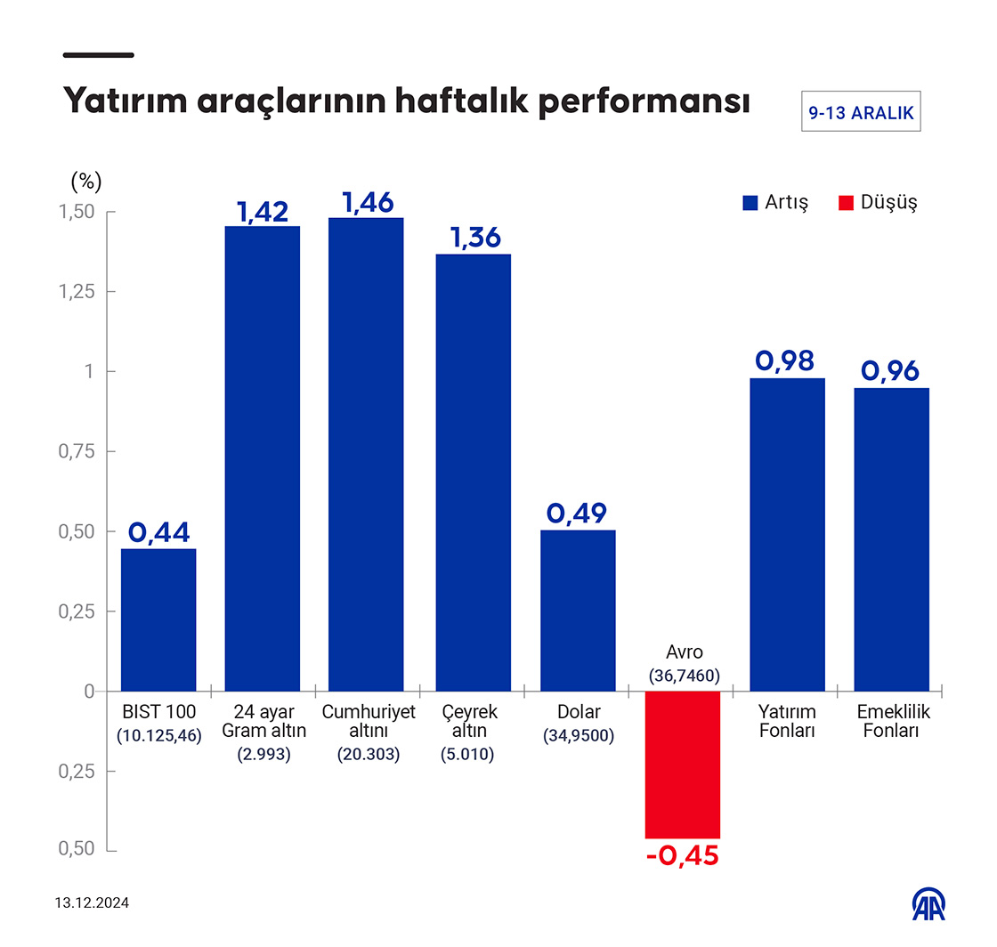 Borsa İstanbul'da işlem gören hisse senetleri haftalık bazda ortalama yüzde 0,44, dolar/TL yüzde 0,49, altının gram fiyatı yüzde 1,42 artarken avro/TL yüzde 0,45 azaldı.