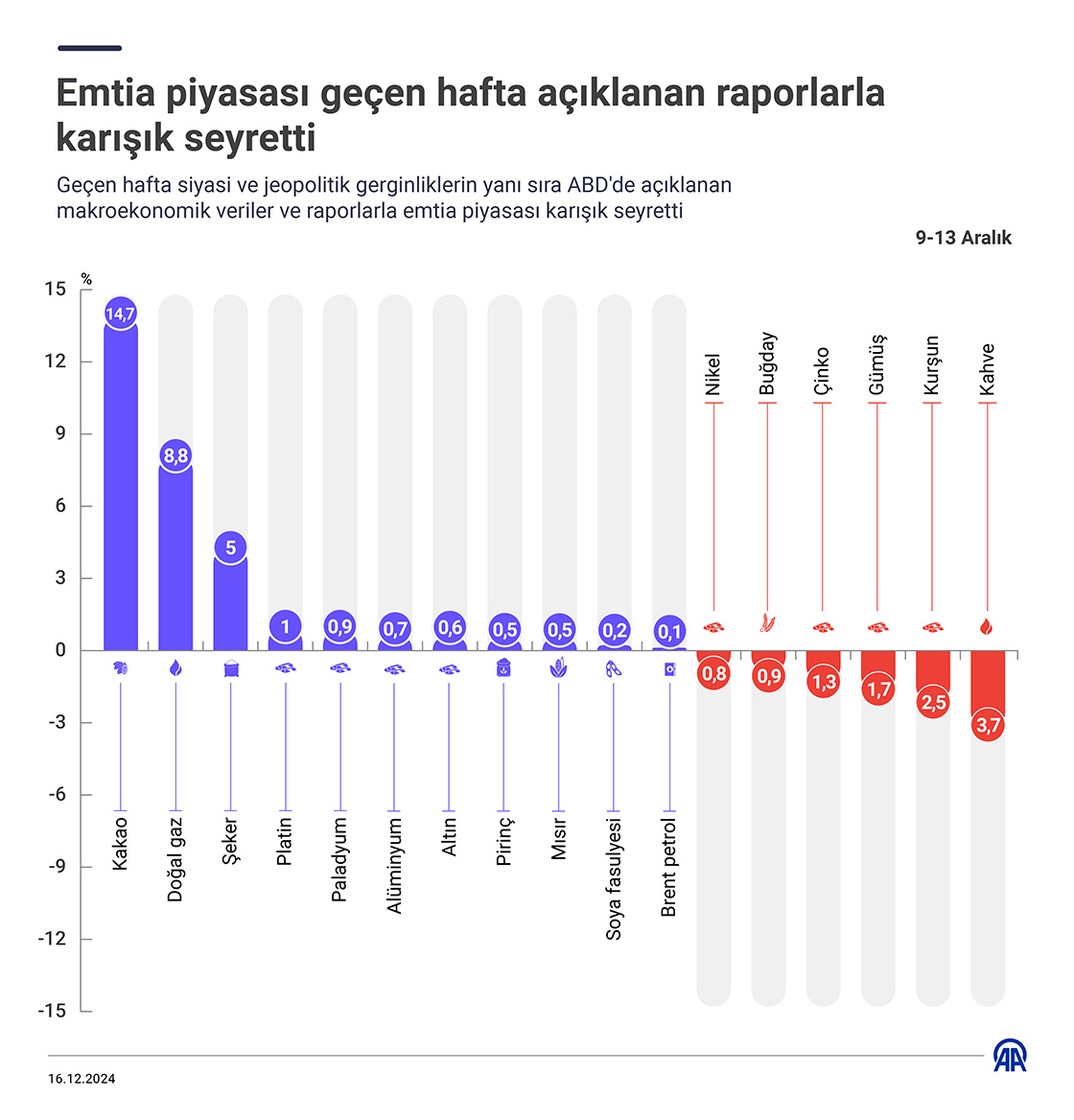 Geçen hafta siyasi ve jeopolitik gerginliklerin yanı sıra ABD'de açıklanan makroekonomik veriler ve raporlarla emtia piyasası karışık seyretti. (Grafik: Muhammet Zeyd Karaaslan/AA)