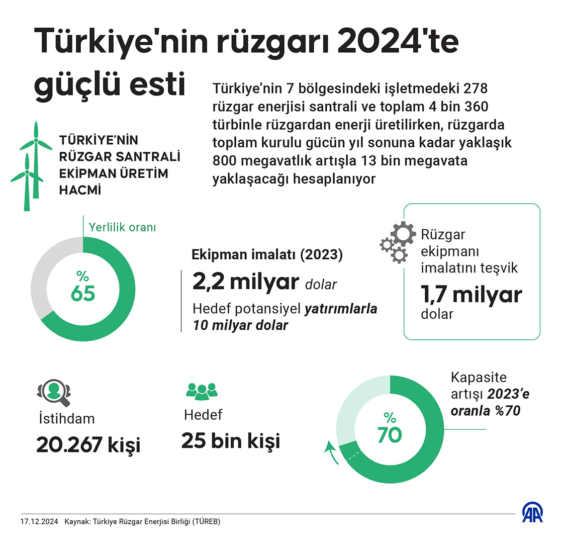 Türkiye’nin 7 bölgesindeki işletmedeki 278 rüzgar enerjisi santrali ve toplam 4 bin 360 türbinle rüzgardan enerji üretilirken, rüzgarda toplam kurulu gücün yıl sonuna kadar yaklaşık 800 megavatlık artışla 13 bin megavata yaklaşacağı hesaplanıyor. (Grafik: Efnan İpşir/AA)17 Aralık 2024•Güncelleme: 17 Aralık 2024