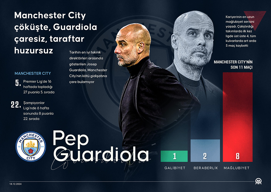 Tarihin en iyi teknik direktörleri arasında gösterilen Josep Guardiola, Manchester City'nin kötü gidişatına çare bulamıyor. (Grafik: Ufuk Celal Güzel/AA)