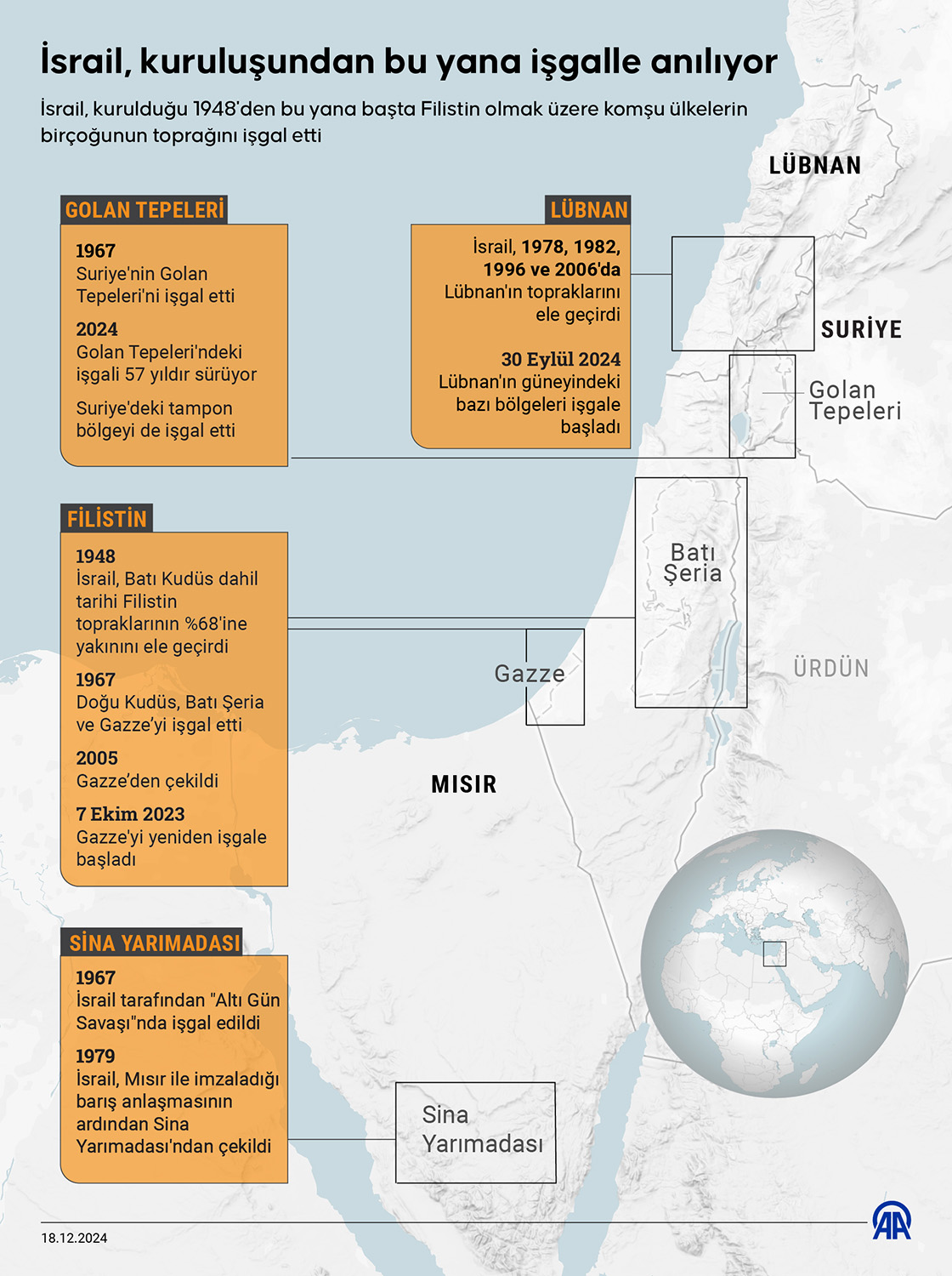 İsrail, kurulduğu 1948'den bu yana başta Filistin olmak üzere komşu ülkelerin birçoğunun toprağını işgal etti ve aradan geçen onlarca seneye rağmen işgal altında tuttuğu toprakların büyük kısmından çekilmedi. (Grafik: Ufuk Celal Güzel/AA)