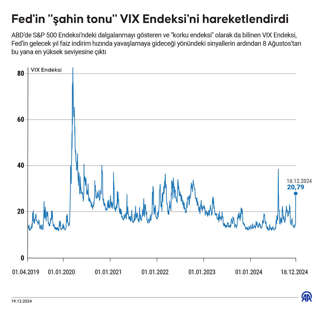 ABD'de S&P 500 Endeksi'ndeki dalgalanmayı gösteren ve "korku endeksi" olarak da bilinen VIX Endeksi, ABD Merkez Bankasının (Fed) gelecek yıl faiz indirim hızında yavaşlamaya gideceği yönündeki sinyallerin ardından dün 8 Ağustos'tan bu yana en yüksek seviyesine çıktı. (Grafik: Mehmet Yaren Bozğun/AA)19 Aralık 2024•Güncelleme: 19 Aralık 2024