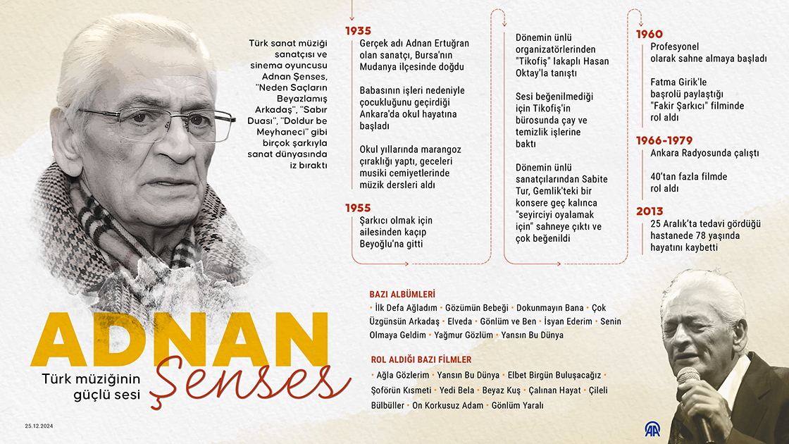 Türk sanat müziği sanatçısı ve sinema oyuncusu Adnan Şenses, 'Neden Saçların Beyazlamış Arkadaş', 'Sabır Duası', 'Doldur be Meyhaneci' gibi birçok şarkıyla sanat dünyasında iz bıraktı. (Grafik: Nuray Yüksel/AA)