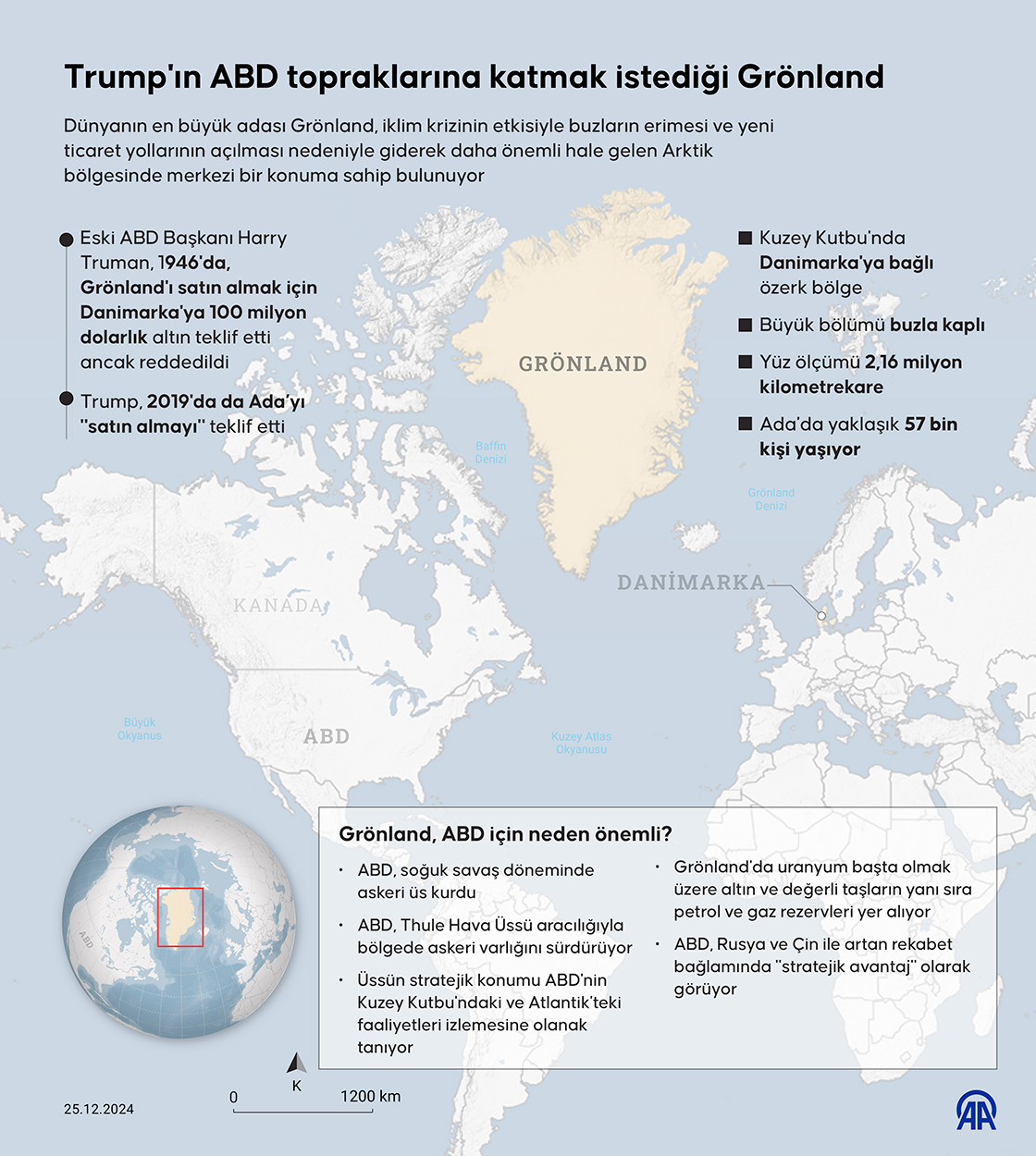 Dünyanın en büyük adası Grönland, iklim krizinin etkisiyle buzların erimesi ve yeni ticaret yollarının açılması nedeniyle giderek daha önemli hale gelen Arktik bölgesinde merkezi bir konuma sahip bulunuyor. (Grafik: Omar Zaghloul/AA)