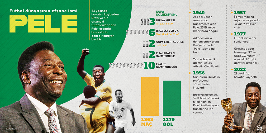 Kolon kanseri nedeniyle uzun süre tedavi gören ve 29 Aralık 2022'de yaşamını yitiren Pele, ardında başarılarla dolu bir kariyer bıraktı. (Grafik: Yasin Demirci/AA)