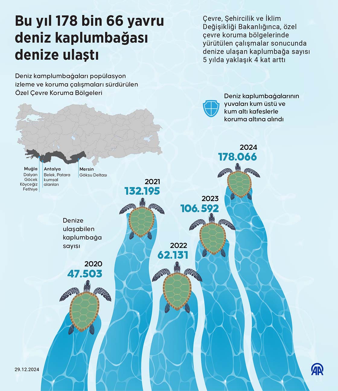 Çevre, Şehircilik ve İklim Değişikliği Bakanlığınca, özel çevre koruma bölgelerinde yürütülen çalışmalar sonucu 2020'de 47 bin 503 olan denize ulaşan kaplumbağa sayısı 5 yılda yaklaşık 4 kat arttı.