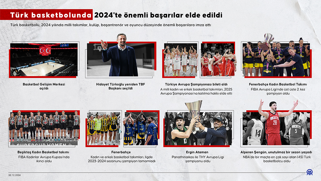 Türk basketbolu, 2024 yılında milli takımlar, kulüp, başantrenör ve oyuncu düzeyinde önemli başarılara imza attı. (Grafik: Elif Acar/AA)