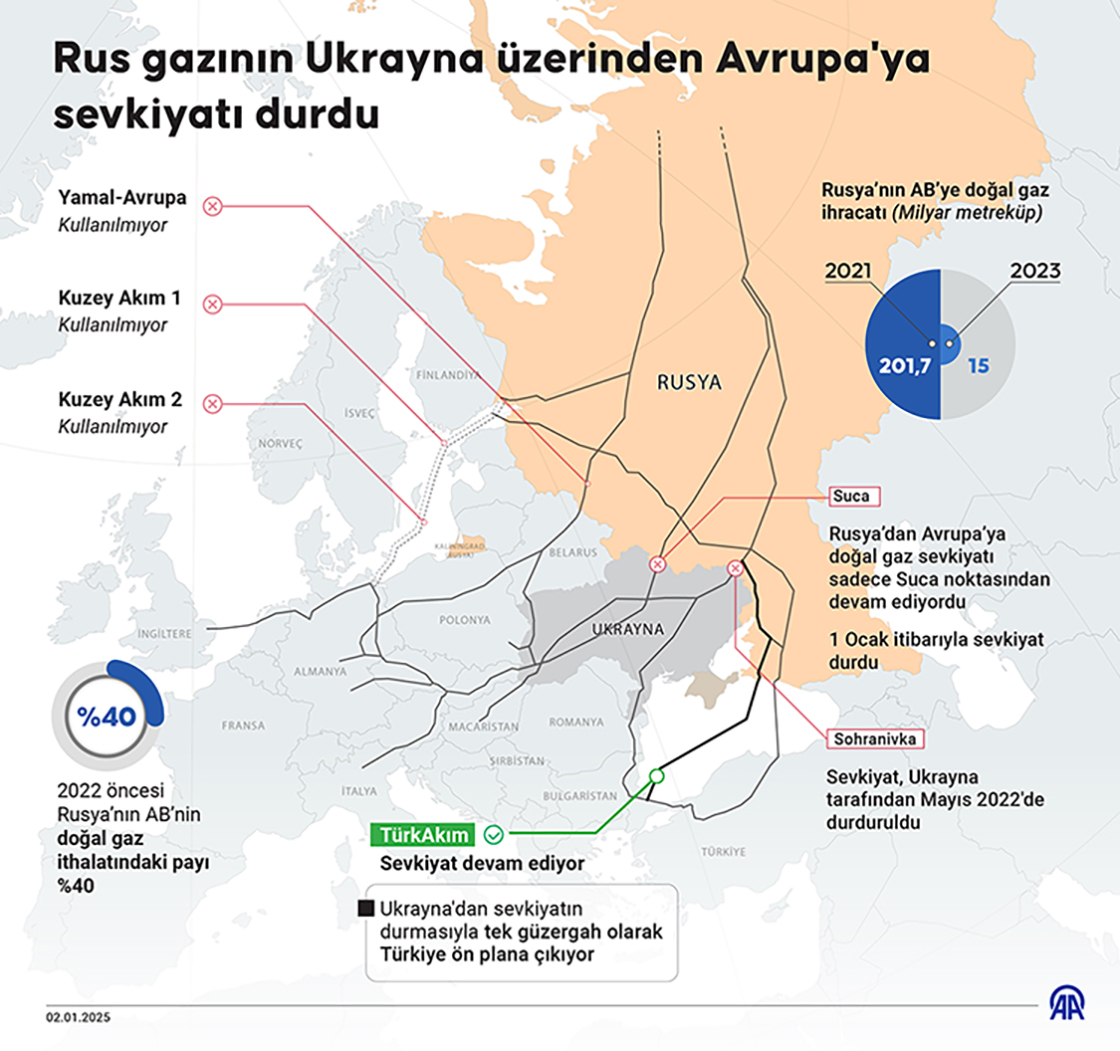 Rus enerji şirketi Gazprom, Ukrayna üzerinden Avrupa'ya doğal gaz sevkiyatının durdurulduğunu bildirdi. (Grafik: Efnan İpşir/AA)