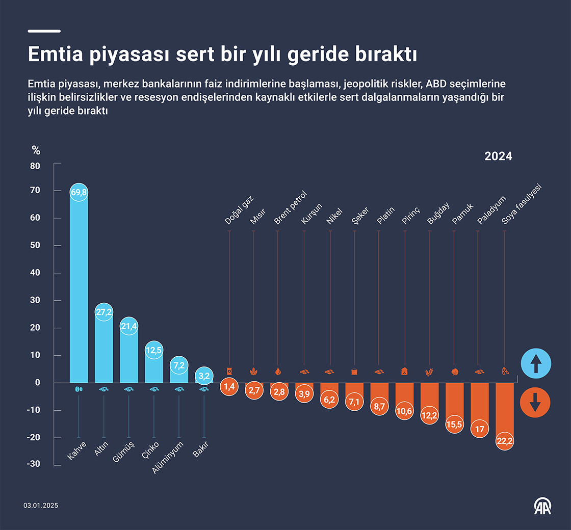 Emtia piyasası, merkez bankalarının faiz indirimlerine başlaması, jeopolitik riskler, ABD seçimlerine ilişkin belirsizlikler ve resesyon endişelerinden kaynaklı etkilerle sert dalgalanmaların yaşandığı bir yılı geride bıraktı. (Grafik: Elif Acar/AA)03 Ocak 2025•Güncelleme: 03 Ocak 2025