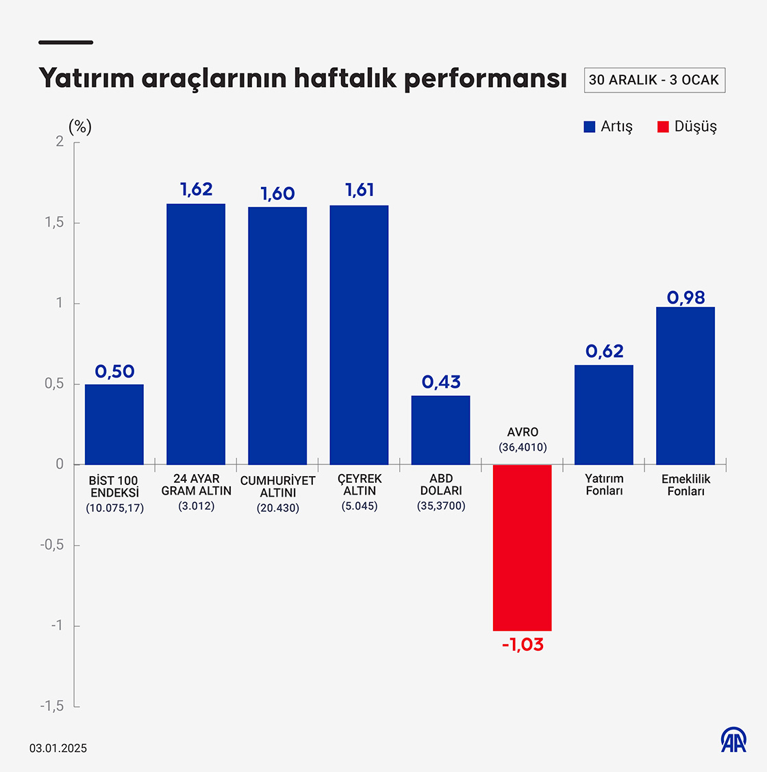 Borsa İstanbul'da işlem gören hisse senetleri haftalık bazda ortalama yüzde 0,50, altının gram fiyatı yüzde 1,62, dolar/TL yüzde 0,43 artış kaydederken, avro/TL yüzde 1,03 azaldı.