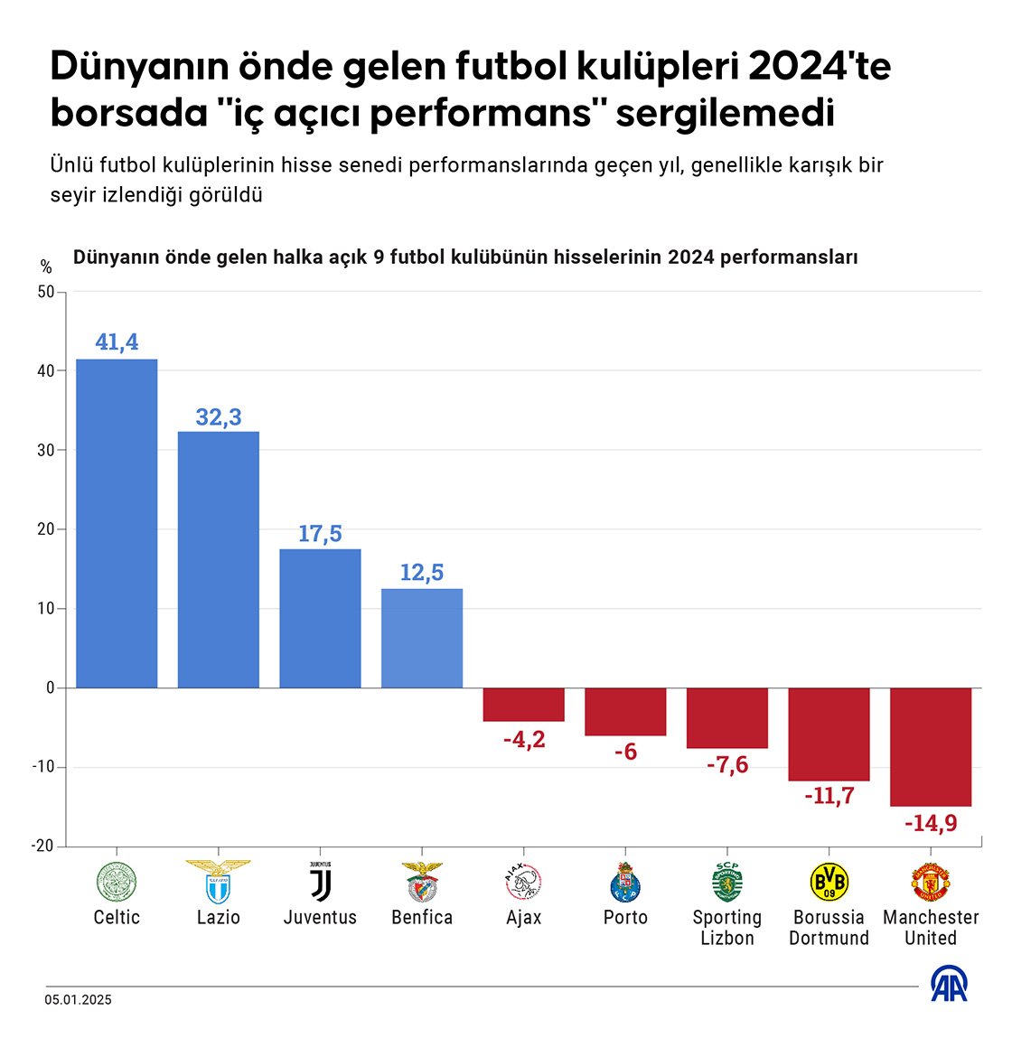 Ünlü futbol kulüplerinin hisse senedi performanslarında geçen yıl, genellikle karışık bir seyir izlendiği görüldü. (Grafik: Muhammed Ali Yiğit/AA)