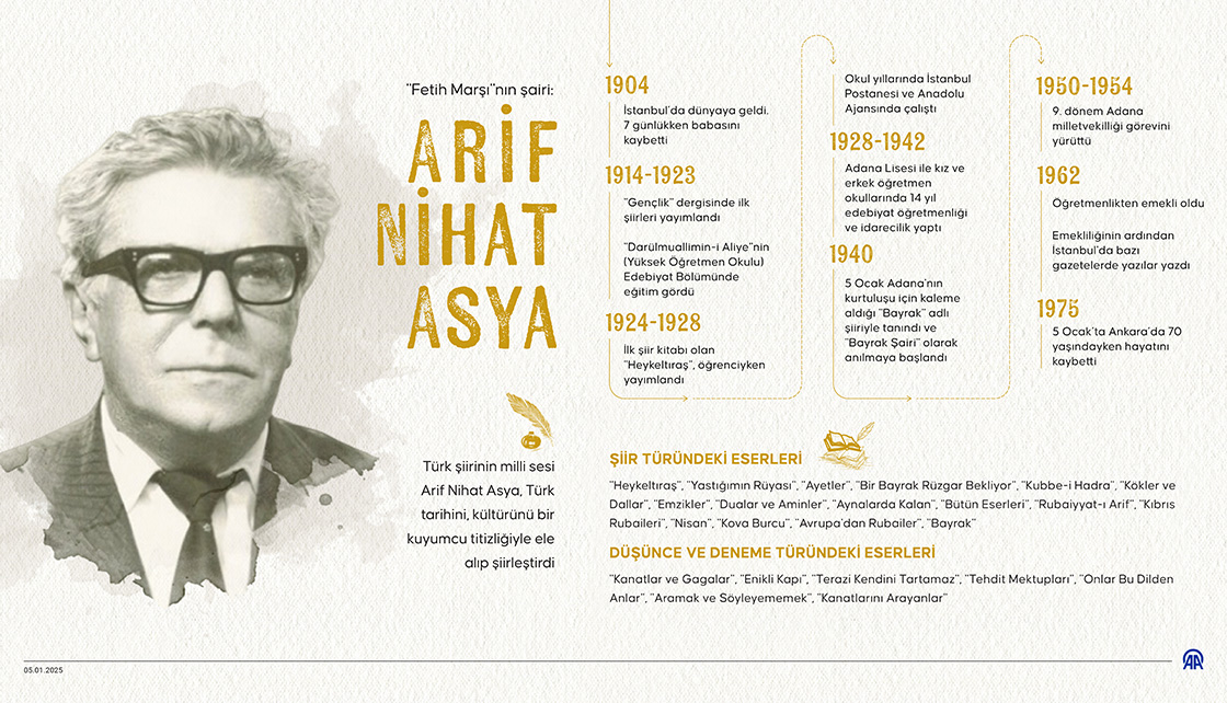 Türk şiirinin milli sesi Arif Nihat Asya, Türk tarihini, kültürünü bir kuyumcu titizliğiyle ele alıp şiirleştirdi. (Grafik: Nuray Yüksel/AA)