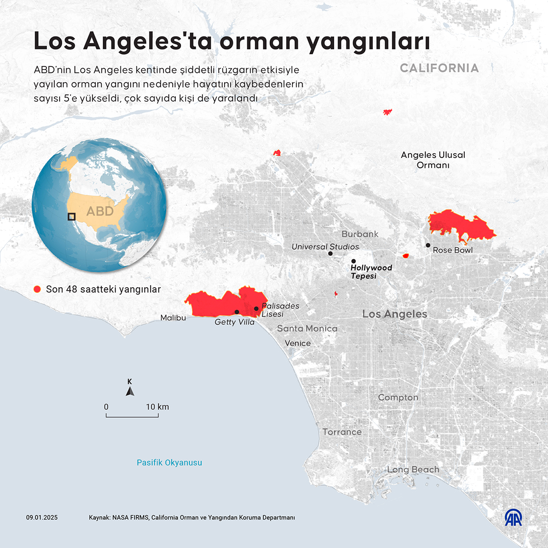 ABD'nin Los Angeles kentinde şiddetli rüzgarın etkisiyle yayılan orman yangını nedeniyle hayatını kaybedenlerin sayısı 5'e yükseldi, çok sayıda kişi de yaralandı. (Grafik: Mehmet Yaren Bozğun/AA)