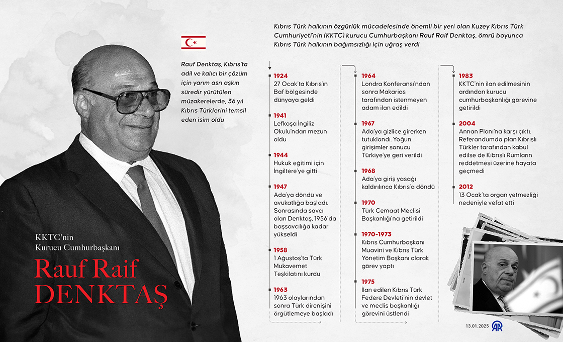 Kıbrıs Türk halkının özgürlük mücadelesinde önemli bir yeri olan Kuzey Kıbrıs Türk Cumhuriyeti'nin (KKTC) kurucu Cumhurbaşkanı Rauf Raif Denktaş, ömrü boyunca Kıbrıs Türk halkının bağımsızlığı için uğraş verdi. (Grafik: Kemal Delikmen/AA)