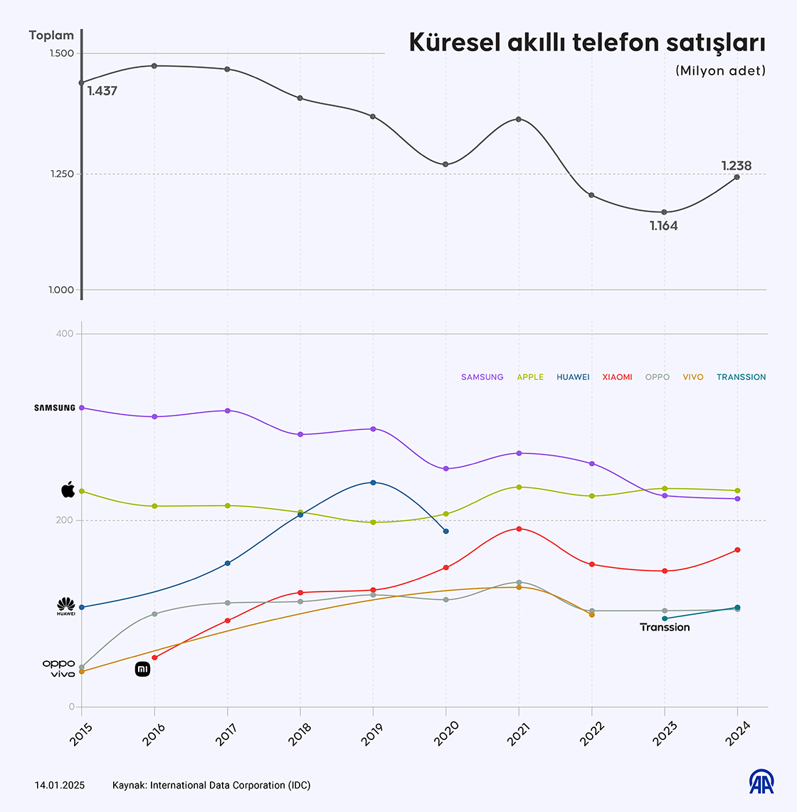 Küresel akıllı telefon satışları geçen yılın dördüncü çeyreğinde 2023'ün aynı dönemine göre yüzde 2,4 artarken, Samsung ile Apple'ın satışlarında ise düşüş kaydedildi. (Grafik: Yasin Demirci/AA)