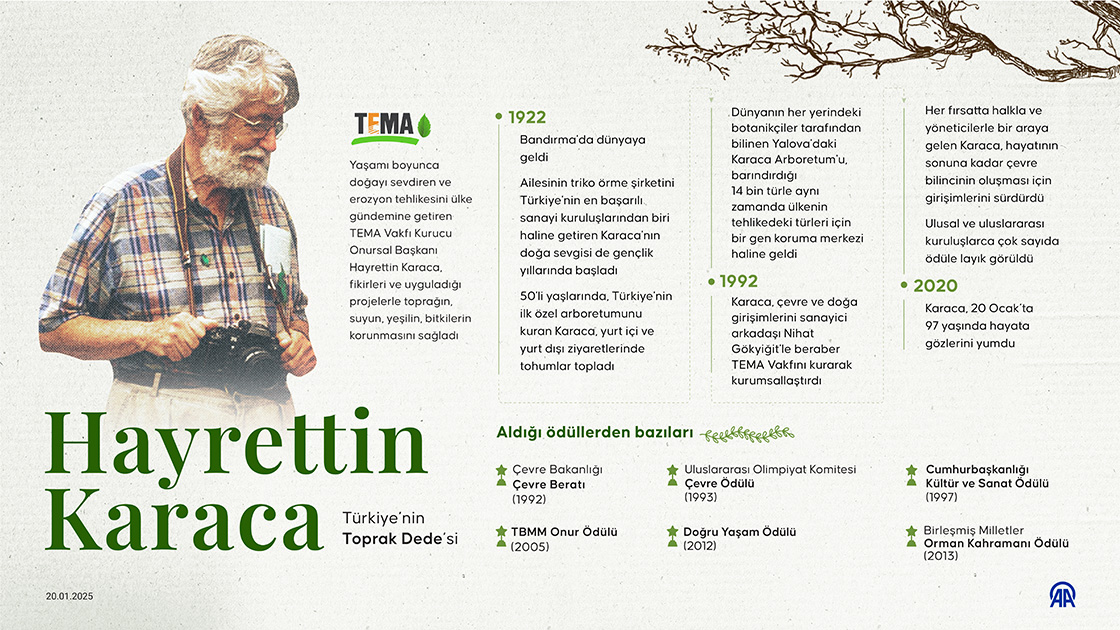 Yaşamı boyunca doğayı sevdiren ve erozyon tehlikesini ülke gündemine getiren TEMA Vakfı Kurucu Onursal Başkanı Hayrettin Karaca, fikirleri ve uyguladığı projelerle toprağın, suyun, yeşilin, bitkilerin korunmasını sağladı. (Grafik: Muhammet Zeyd Karaaslan/AA)20 Ocak 2025•Güncelleme: 20 Ocak 2025