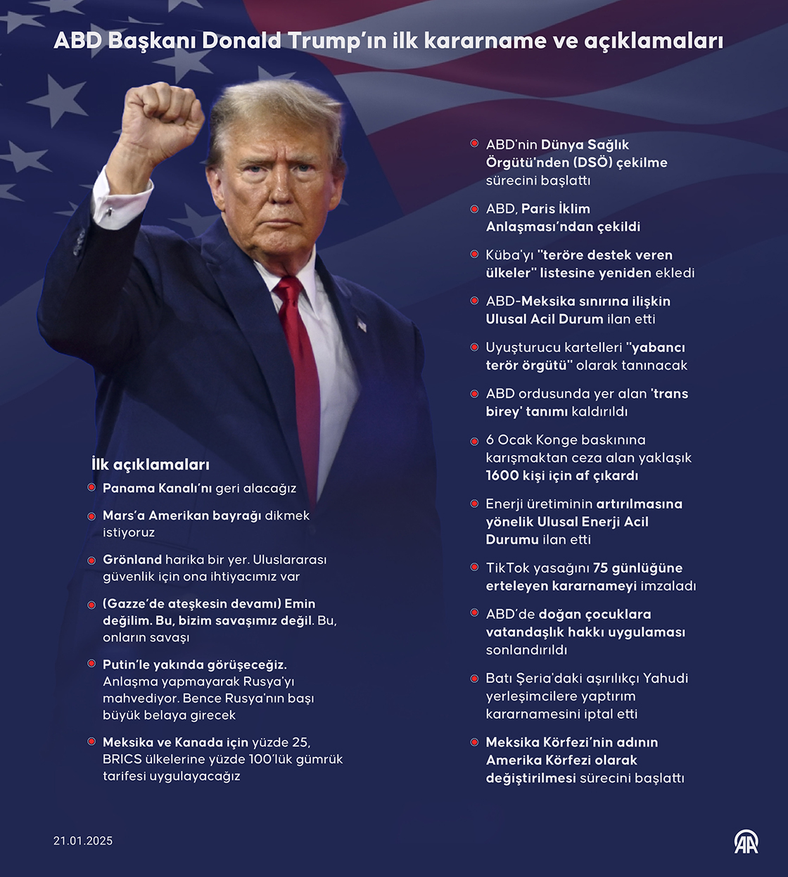 ABD Başkanı Donald Trump, görevinin ilk gününde eski başkan Joe Biden yönetiminin iç politikadan dış politikaya kadar birçok alandaki icraatlarını geçersiz kılan çok sayıda başkanlık kararnamesine imza attı. (Grafik: Omar Zaghloul/AA)