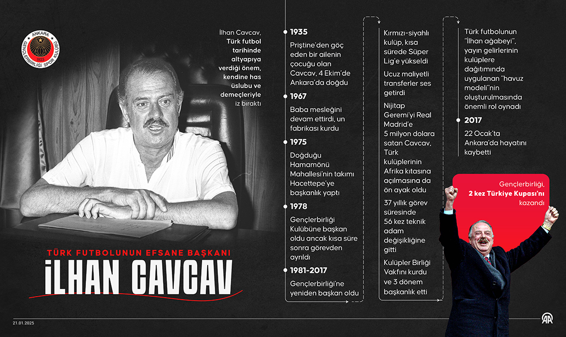 37 yıl Gençlerbirliği'nin başkanlığını yapan efsane başkan İlhan Cavcav, Türkiye futbol tarihinde altyapıya verdiği önem, transferler, teknik direktör değişiklikleri, kendine has üslubu ve demeçleriyle iz bıraktı. (Grafik: Ufuk Celal Güzel/AA)