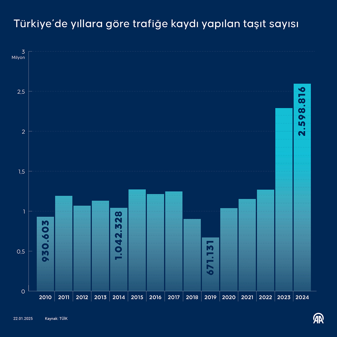 Türkiye'de 2024'te 2 milyon 598 bin 816 taşıtın trafiğe kaydı yapıldı, 36 bin 657 taşıtın kaydı silindi. (Grafik: Mehmet Yaren Bozğun/AA)