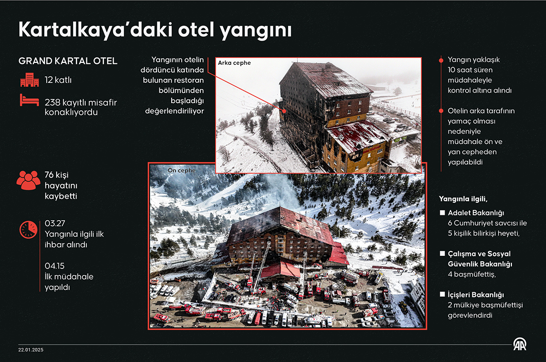 Yangının otelin dördüncü katında bulunan restoran bölümünden başladığı değerlendiriliyor. (Grafik: Ufuk Celal Güzel/AA)
