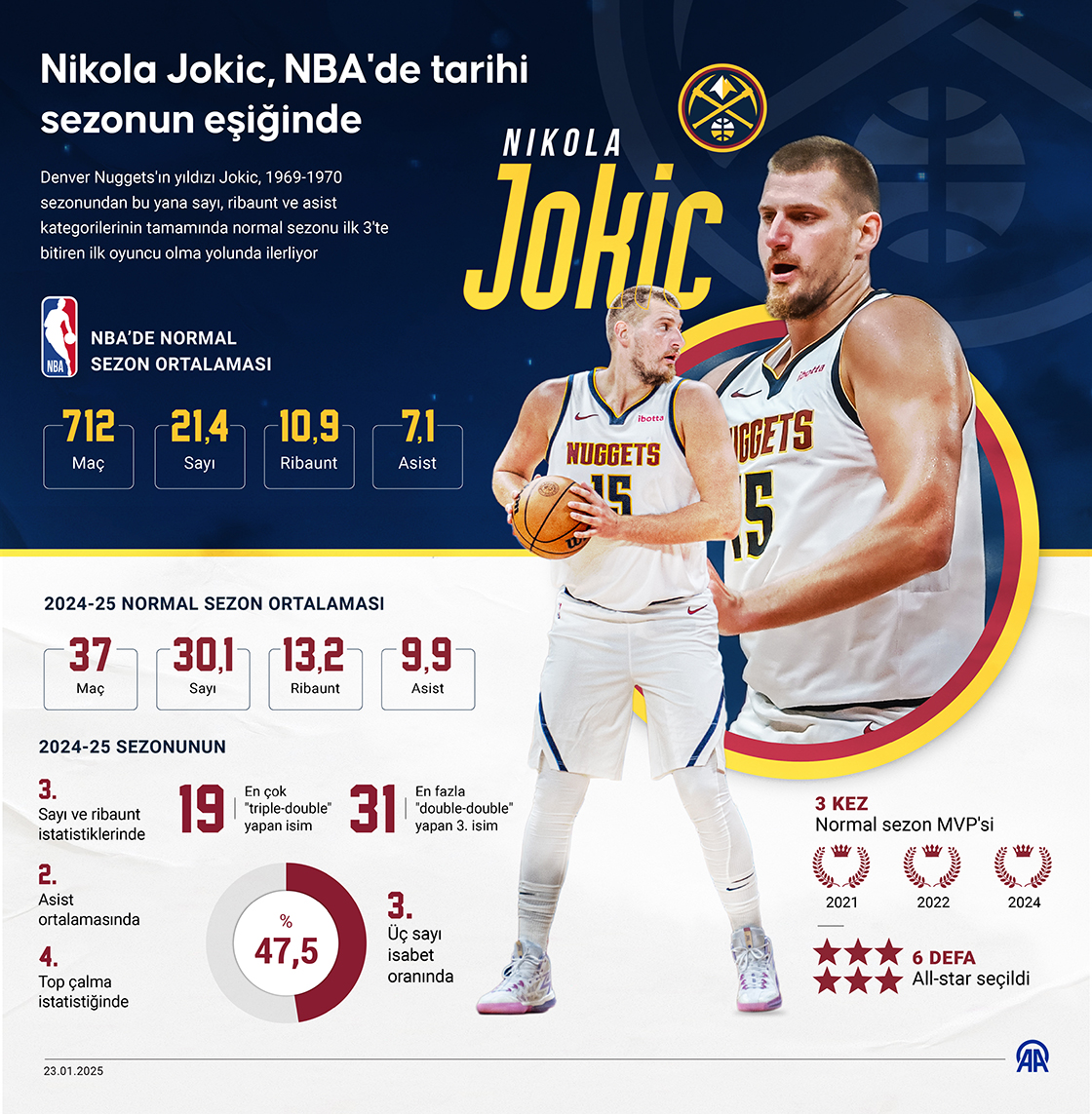 Denver Nuggets'ın yıldızı Jokic, 1969-1970 sezonundan bu yana sayı, ribaunt ve asist kategorilerinin tamamında normal sezonu ilk 3'te bitiren ilk oyuncu olma yolunda ilerliyor. (Grafik: Muhammed Ali Yiğit/AA)