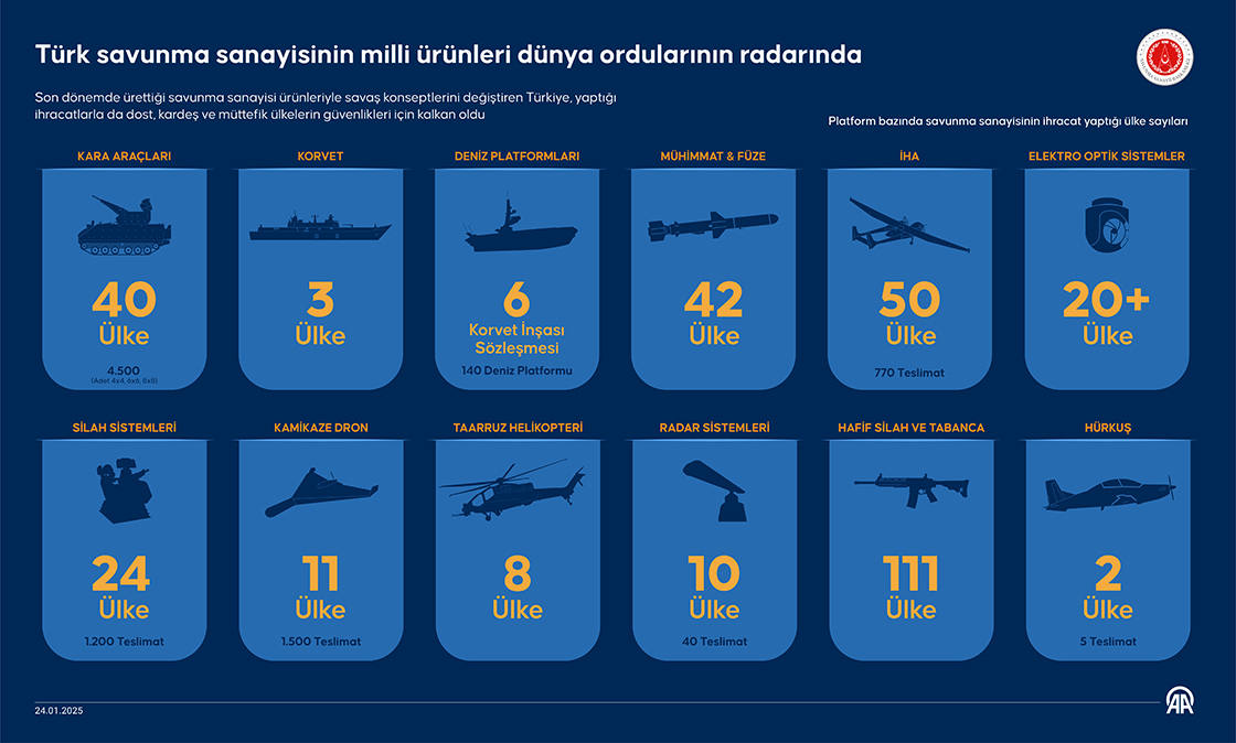 Son dönemde ürettiği savunma sanayisi ürünleriyle savaş konseptlerini değiştiren Türkiye, yaptığı ihracatlarla da dost, kardeş ve müttefik ülkelerin güvenlikleri için kalkan oldu. (Grafik: Ufuk Celal Güzel/AA)