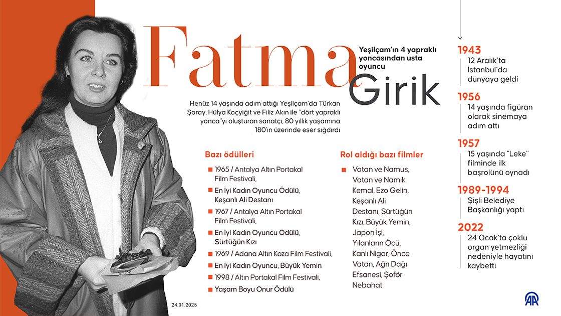 Kariyeri boyunca 180'in üzerinde filmde ve birçok dizide rol alan sanatçı, Memduh Ün'ün yönetmenliğini üstlendiği 1960 yapımı 'Ölüm Peşimizde' filmindeki rolüyle dikkati çekti. (Grafik: Nuray Yüksel/AA)