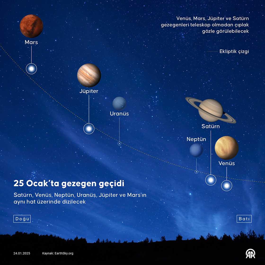 Jüpiter, Satürn, Venüs, Mars, Uranüs ve Neptün birbirine yakın bir şekilde gökyüzünde hizalanacak. (Grafik: Yasin Demirci/AA)