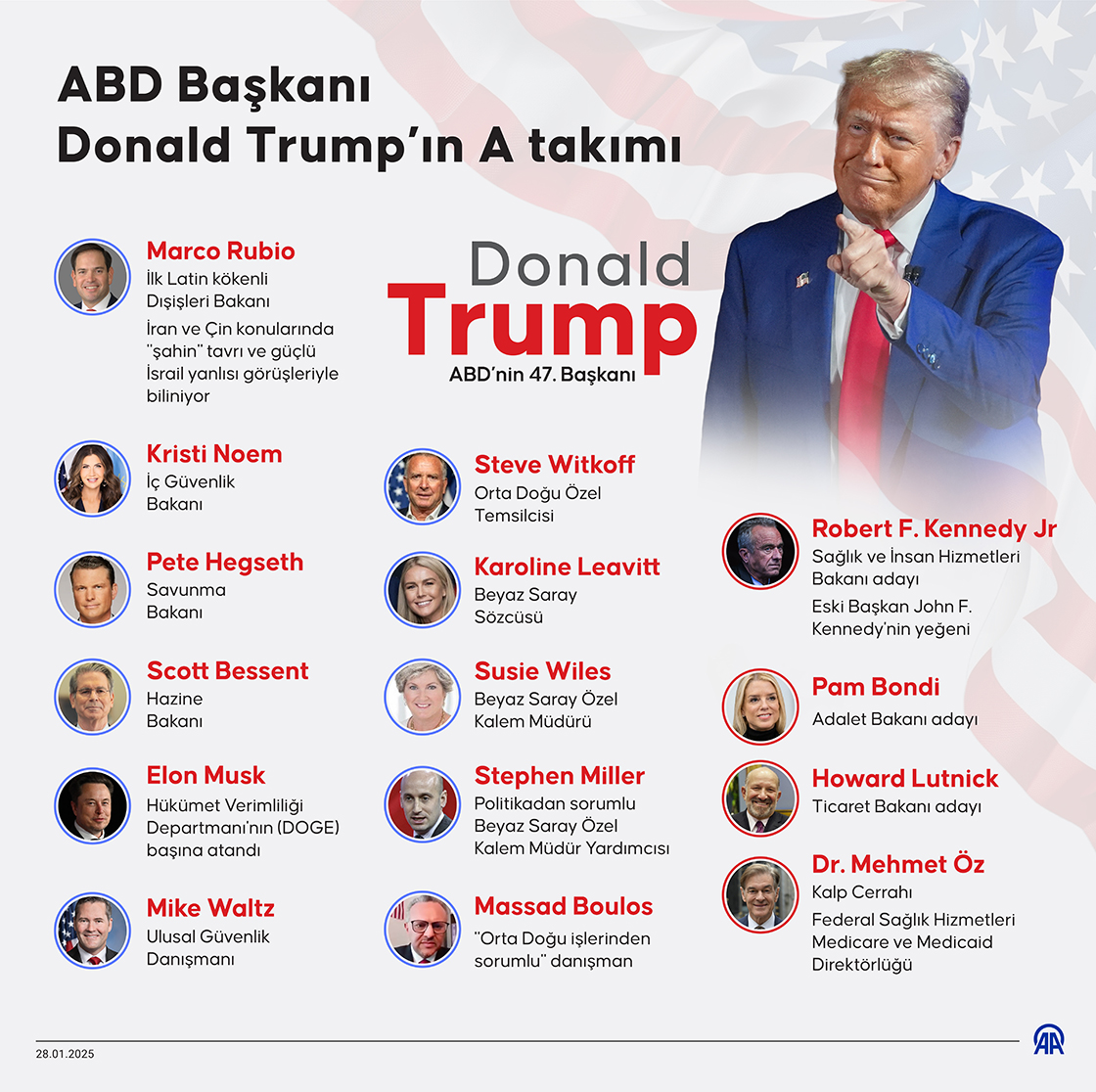 Siyasi kariyerine damga vuran yönetim tarzı ve tartışmalı kararlarıyla tanınan ABD'nin 47. Başkanı Donald Trump, yeni görev dönemi için kabine üyeleri ve danışmanlarını yakın çevresinden ve popüler isimlerden seçmesiyle gündem oldu. (Grafik: Elif Acar/AA)