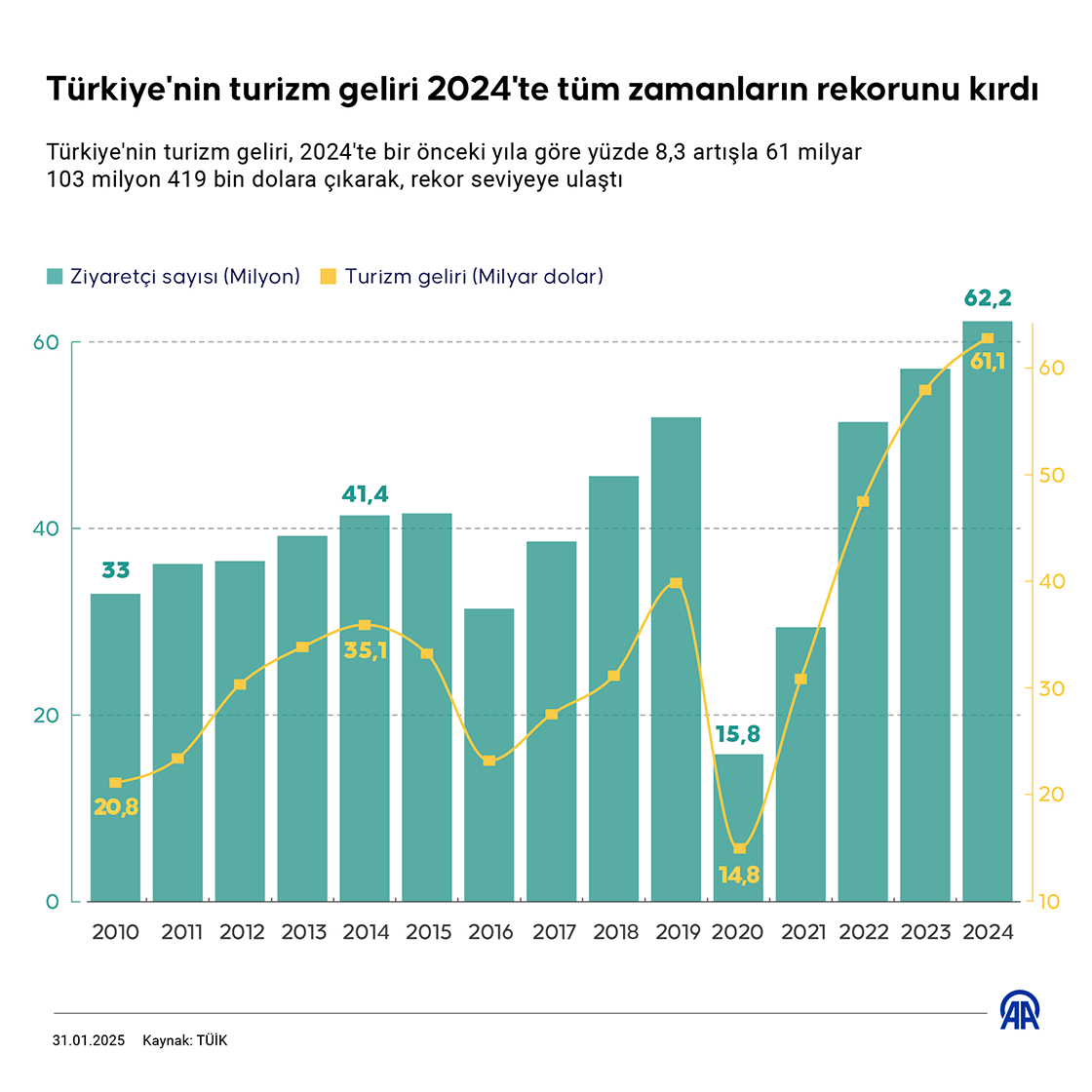 Türkiye'nin turizm geliri, 2024'te bir önceki yıla göre yüzde 8,3 artışla 61 milyar 103 milyon 419 bin dolara çıkarak, rekor seviyeye ulaştı. (Grafik: Efnan ipşir/AA)