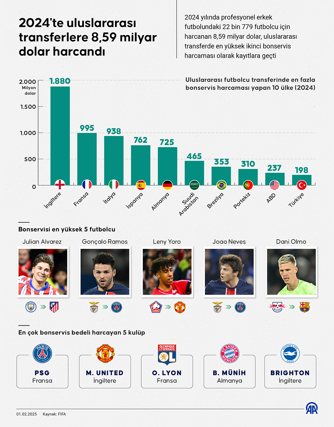 2024 yılında profesyonel erkek futbolundaki 22 bin 779 futbolcu için harcanan 8,59 milyar dolar, uluslararası transferde en yüksek ikinci bonservis harcaması olarak kayıtlara geçti. (Grafik: Elif Acar/AA)