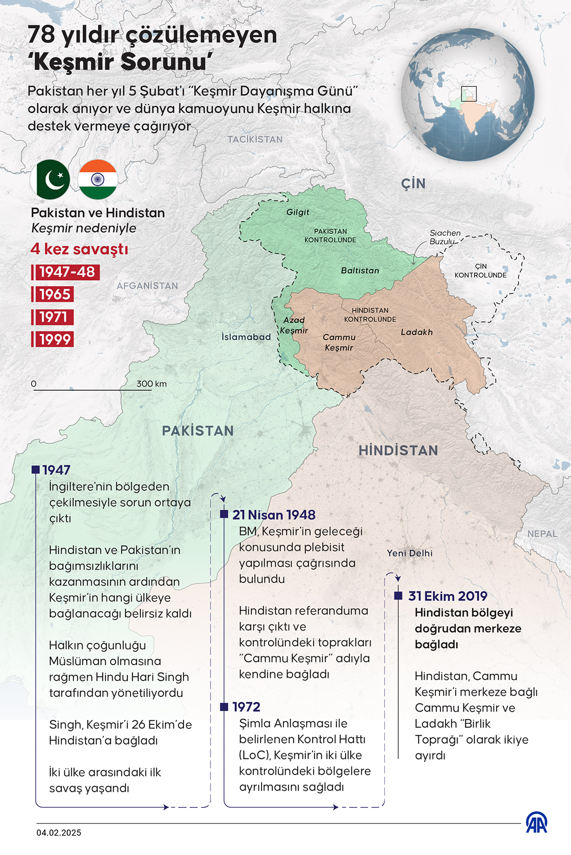 Keşmir’in hangi ülke toprakları içerisinde yer alacağı meselesi, Güney Asya'nın en uzun süreli ihtilaflarından biri olarak, 78 yıldır çözüme kavuşmayı bekliyor. (Grafik: Ufuk Celal Güzel/AA)