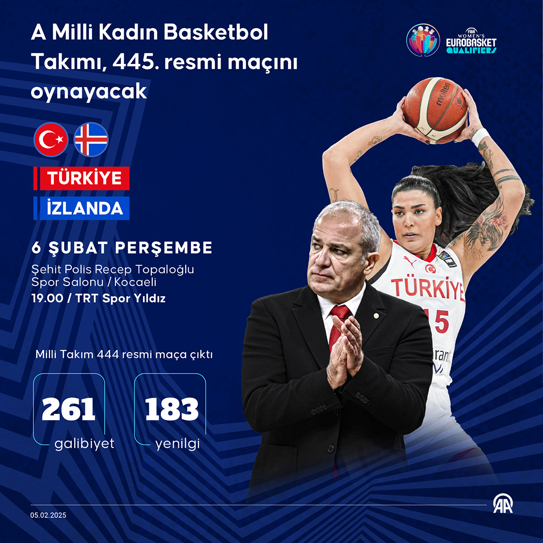 A Milli Kadın Basketbol Takımı, tarihindeki 445. resmi maçına, 2025 Avrupa Şampiyonası Elemeleri F Grubu'nda İzlanda karşısında çıkacak. (Grafik: Ufuk Celal Güzel/AA)