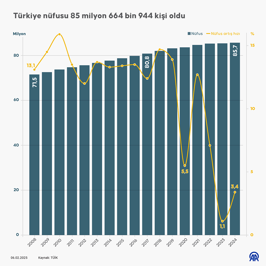 Türkiye'nin nüfusu, 2024'te bir önceki yıla göre 292 bin 567 kişi artarak 85 milyon 664 bin 944 oldu. (Grafik: Yasin Demirci/AA)