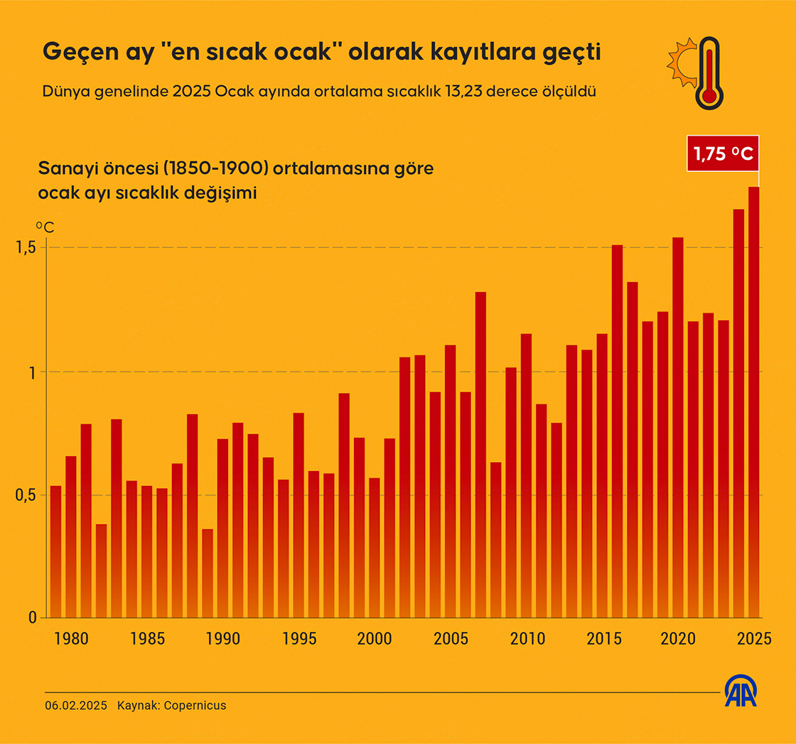 Dünya genelinde 2025 Ocak ayında ortalama sıcaklık 13,23 derece ölçüldü. (Grafik: Ufuk Celal Güzel/AA)