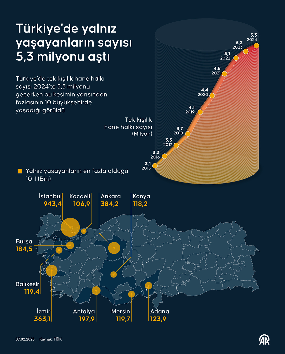 Türkiye'de tek kişilik hane halkı sayısı 2024'te 5,3 milyonu geçerken, yalnız yaşayanların başı çektiği il 943 bin 363 kişiyle İstanbul oldu. (Grafik: Mehmet Yaren Bozğun/AA)