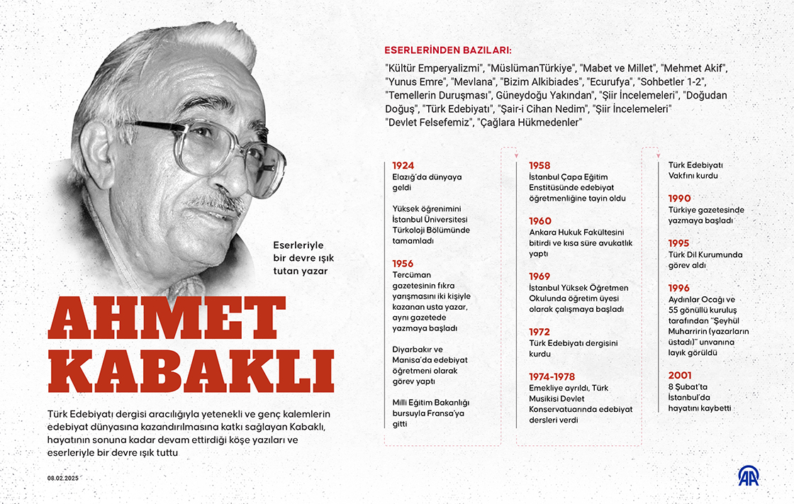 Türk Edebiyatı dergisi aracılığıyla yetenekli ve genç kalemlerin edebiyat dünyasına kazandırılmasına katkı sağlayan Kabaklı, hayatının sonuna kadar devam ettirdiği köşe yazıları ve eserleriyle bir devre ışık tuttu. (Grafik: Kemal Delikmen/AA)