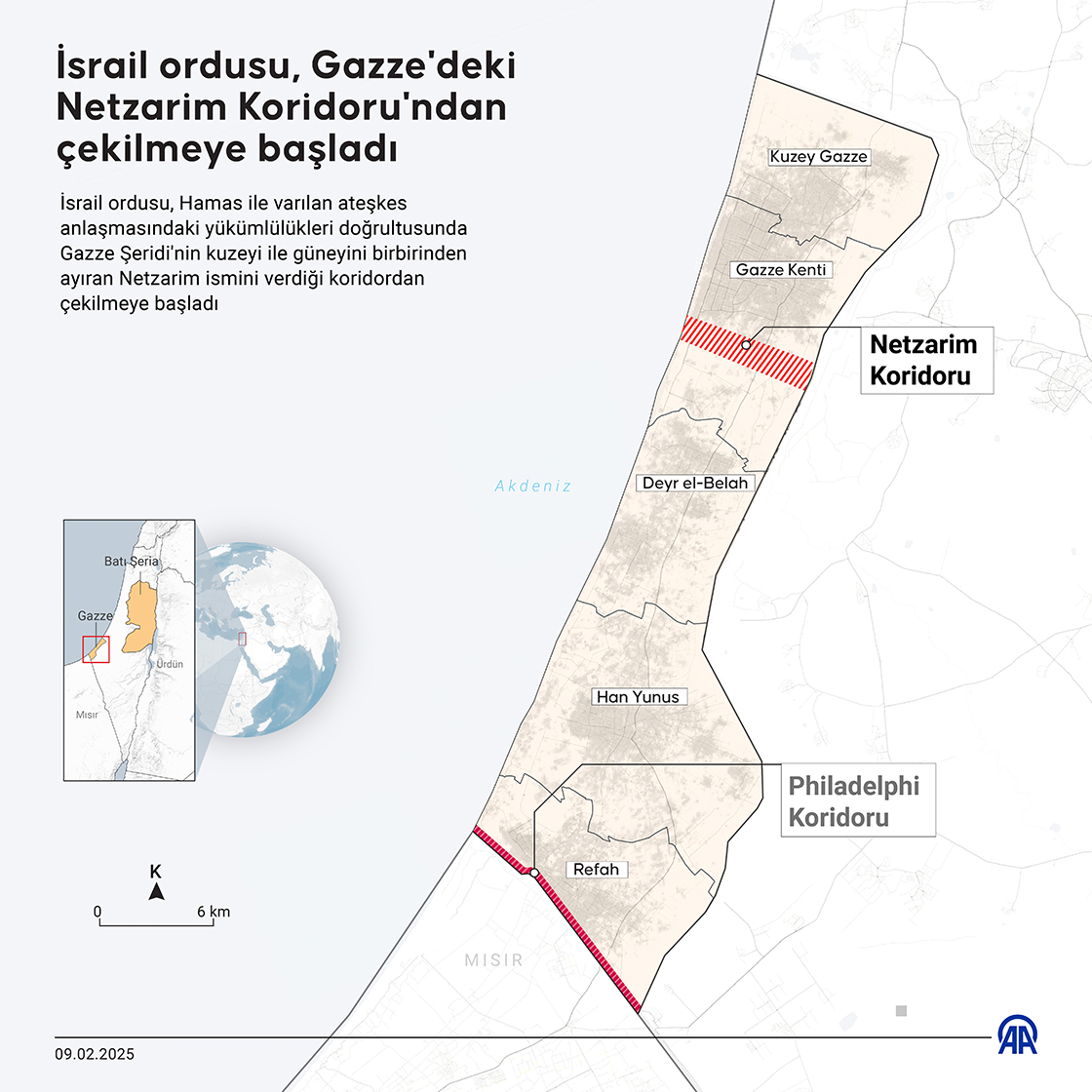 İsrail ordusu, Hamas ile varılan ateşkes anlaşmasındaki yükümlülükleri doğrultusunda Gazze Şeridi'nin kuzeyi ile güneyini birbirinden ayıran Netzarim ismini verdiği koridordan çekilmeye başladı. (Grafik: Elif Acar/AA)