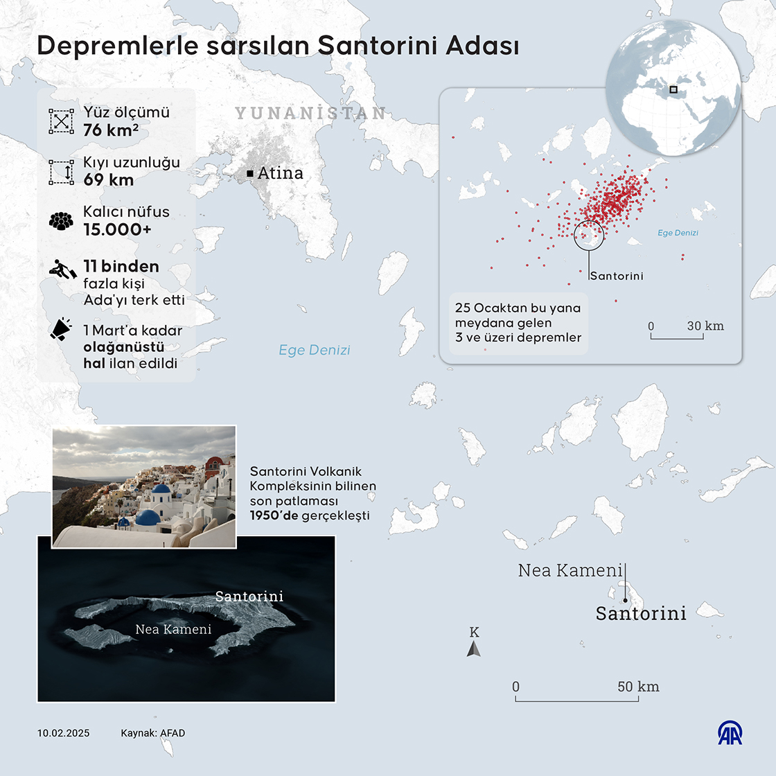Depremlerle sarsılan Santorini Adası. (Grafik: Mehmet Yaren Bozğun/AA)