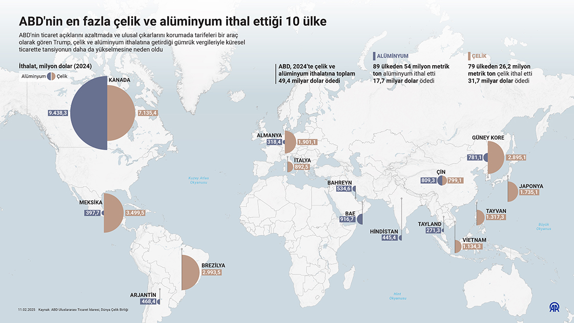 ABD'nin ticaret açıklarını azaltmada ve ulusal çıkarlarını korumada tarifeleri bir araç olarak gören ABD Başkanı Donald Trump, son olarak çelik ve alüminyum ithalatına getirdiği gümrük vergileriyle küresel ticarette tansiyonun daha da yükselmesine neden oldu. (Grafik: Efnan ipşir/AA)11 Şubat 2025•Güncelleme: 11 Şubat 2025