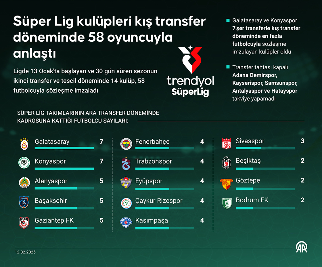 Ligde 13 Ocak'ta başlayan ve 30 gün süren sezonun ikinci transfer ve tescil döneminde 14 kulüp, 58 futbolcuyla sözleşme imzaladı. (Grafik: Muhammed Ali Yiğit/AA)