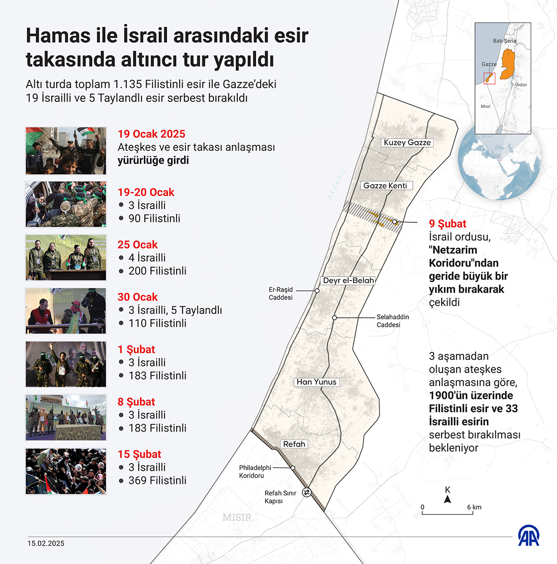 Altı turda toplam 1.135 Filistinli esir ile Gazze’deki 19 İsrailli ve 5 Taylandlı esir serbest bırakıldı
