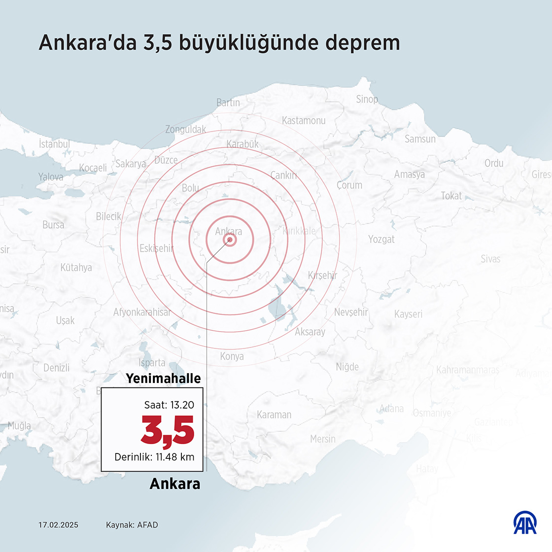 Ankara'da, saat 13.20'de 3,5 büyüklüğünde deprem meydana geldi. (Grafik: Muhammed Ali Yiğit/AA)