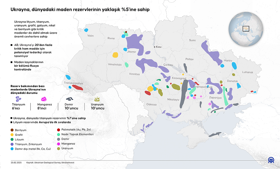 Ukrayna lityum, titanyum, uranyum, grafit, galyum, nikel ve berilyum gibi kritik madenler de dahil olmak üzere önemli cevherlere sahip. (Grafik: Omar Zaghloul/AA)