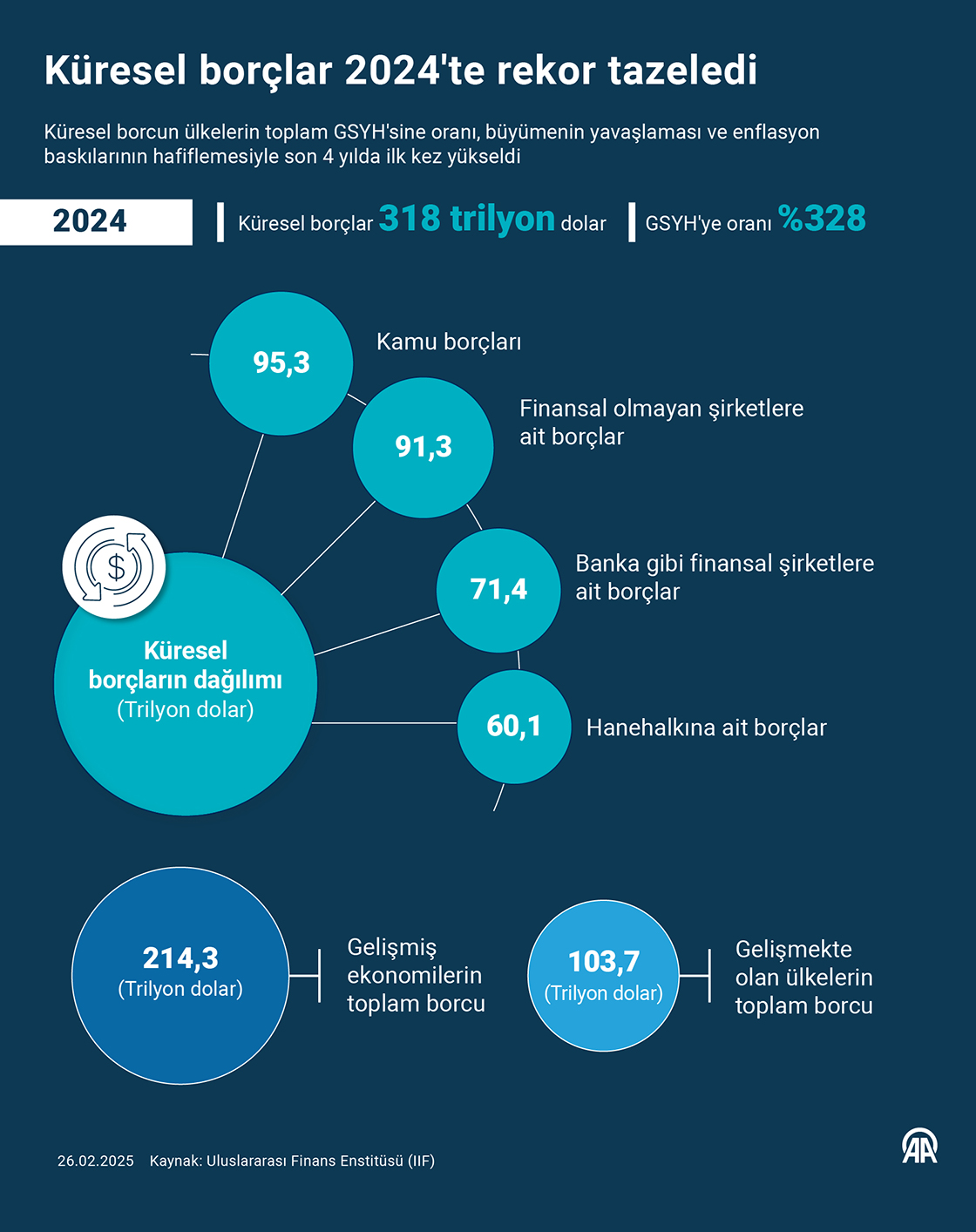 Küresel borcun ülkelerin toplam GSYH'sine oranı, büyümenin yavaşlaması ve enflasyon baskılarının hafiflemesiyle son 4 yılda ilk kez yükseldi. (Grafik: Efnan İpşir/AA)